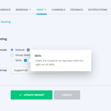 Userlike tilbyr et variert og unikt funksjonssett på mange områder, og det prøver å gjøre noe nytt for live chat-spillet. Livechatten støtter videresending av chat som lar deg overføre chatter til en annen kollega. Dette er ganske likt billettoverføringer i billettprogramvare, som er ganske nyttig i mange situasjoner. Userlike tilbyr også en mulighet til å velge hovedferdighetene for hver chatteagent, slik at kundene kan velge hvilken ekspert de vil snakke med. Dette alternativet er også sett i billettprogramvare, og det er kjent som chat-ruting. Det er en flott funksjon å ha i live chat og enda bedre å se den med flere rutealternativer basert på ferdigheter.