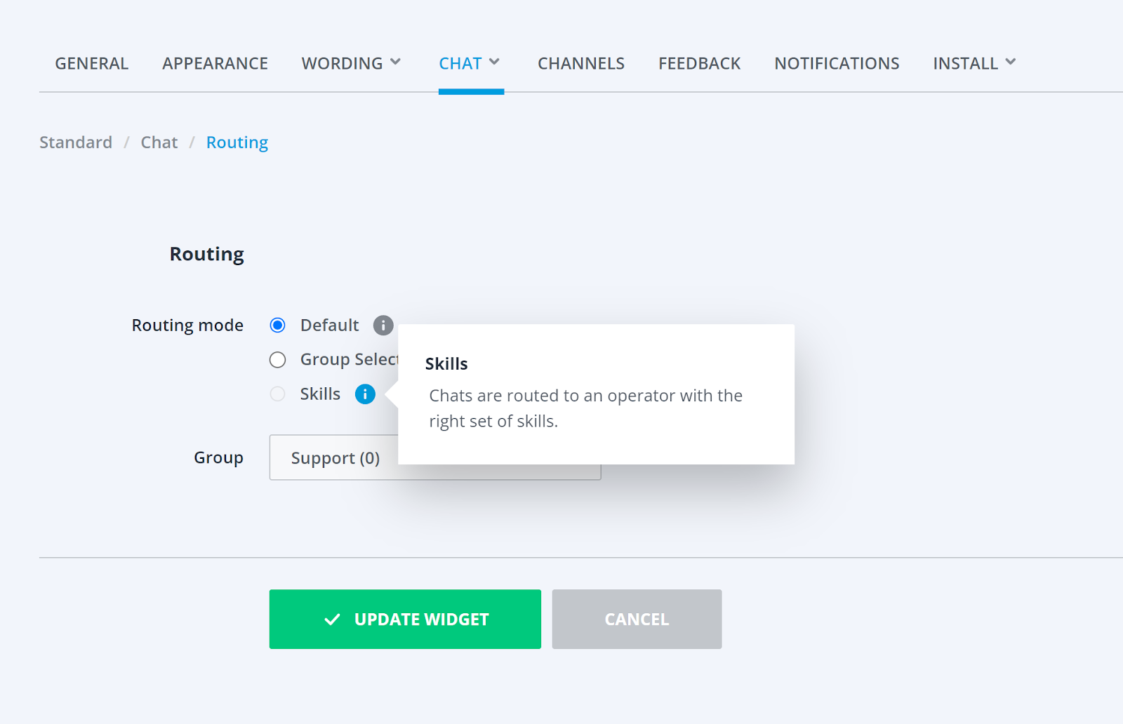 Hvis bare én av live chat-operatørene mottar innkommende chatter, kan problemet ha mange løsninger. Først av alt, sjekk om de gjenværende operatørene som ikke mottar chatter er i riktig operatørgruppe. Hver live chat-widget har innstillinger relatert til operatørgrupper eller avdelinger. Åpne chat-widget-innstillingene og gå til Chat > Ruting og endre gruppen, eller legg til de gjenværende agentene som ikke mottar chatter i samme gruppe som operatøren som mottar chatter. Den andre løsningen kan være relatert til tilgjengeligheten av chatteautomater. Operatøren med det høyeste antallet åpne spilleautomater er mer sannsynlig å motta nye chatter. Du kan justere antall plasser under Team > Operatører i hver operatørprofil. En annen løsning er å sjekke om alle operatører er online. Sist, men ikke minst, hvis det er noen gjentakende kontakter som bruker livechatten, vil de ha større sannsynlighet for å få kontakt med den samme operatøren de har chattet med før.