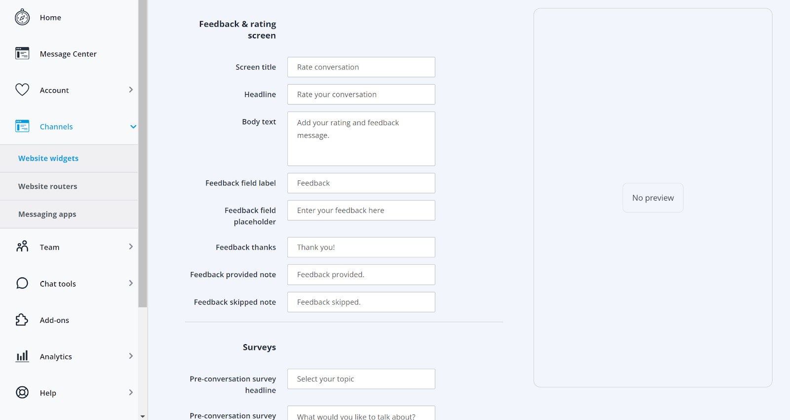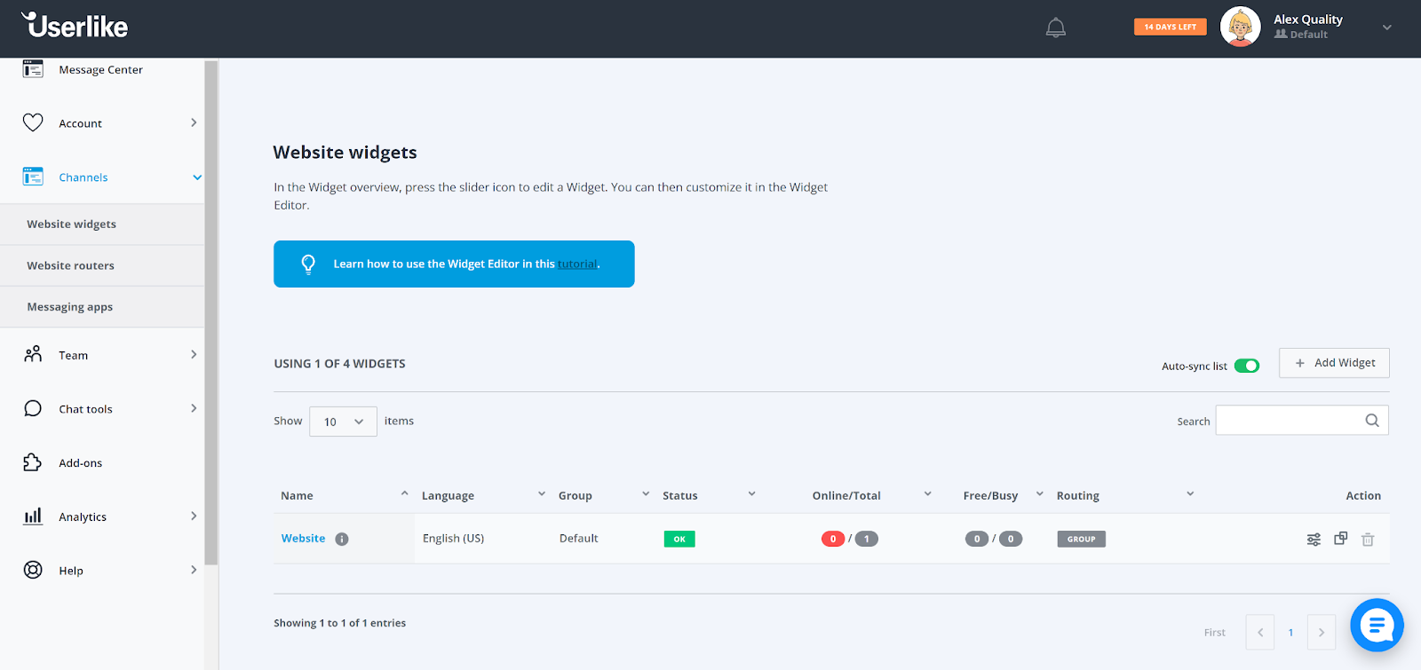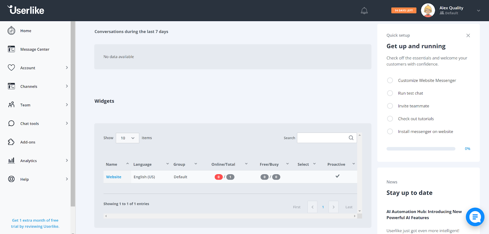 Menyen til høyre viser hele det tilgjengelige Userlike-verktøysettet, inkludert chat-verktøyene. Når du klikker på elementet, kan du bli litt skuffet over den forvirrende visningen. Den presenterer kun samtalestatistikk. Det ser imidlertid ikke ut til å være en måte å opprette eller legge til en live chat, noe som fører til et lengre søk rundt grensesnittet. Selve alternativet er skjult under Kanaler-menyen der du kan opprette nye widgets for nettstedet.