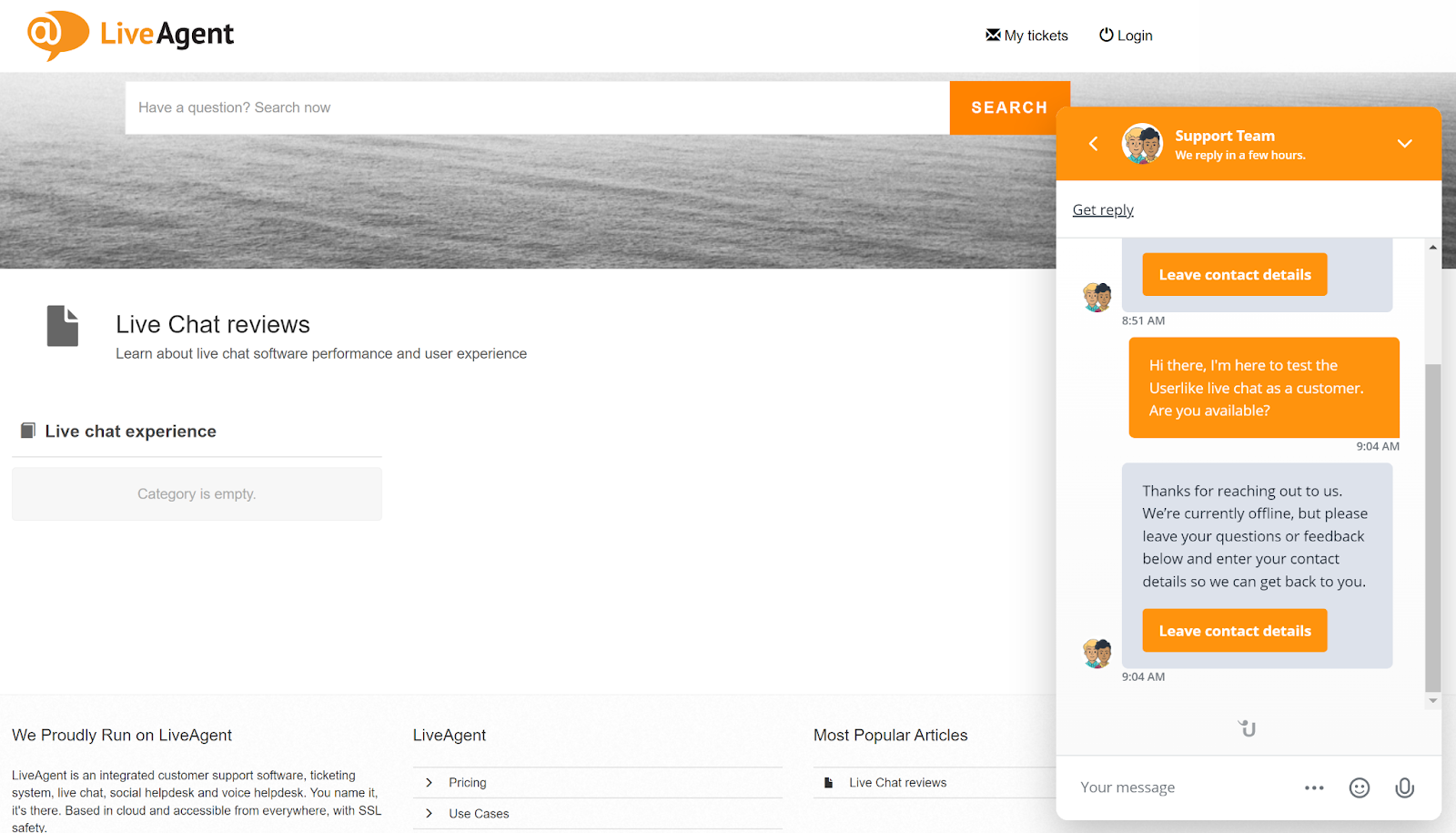 Når du er ferdig med hele tilpasningen og konfigurasjonen, er det på tide å installere chat-widgeten. Siden presenterer ett installasjonsalternativ ved å kopiere en live chat-kode direkte til nettstedet ditt. Det er også en knapp for å hjelpe deg med å kontakte nettsideprogrammereren din for å gjøre det for deg, som tar deg til et enkelt kontaktskjema hvor du kan sende forespørselen til programmererens e-postadresse. Jeg valgte å gjøre det selv, så jeg kopierte og limte inn koden på testnettstedet mitt. Alt fungerte uten problemer, og jeg var klar til å begynne å teste. Men først, la oss se på hva du kan forvente av Userlike live chat-funksjoner.