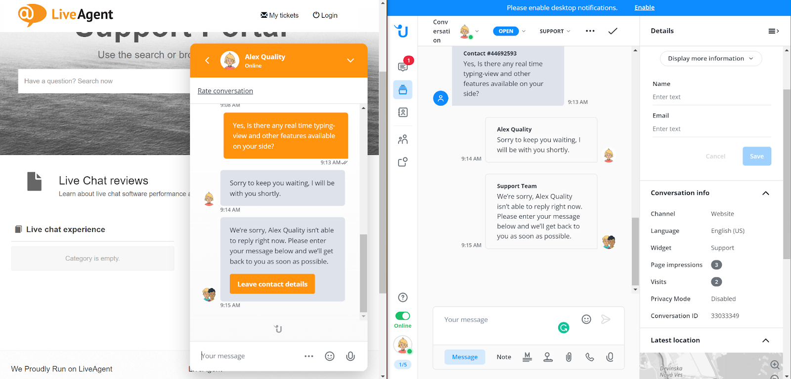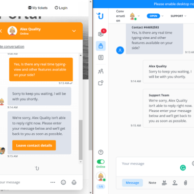 Etter å ha tildelt chatten selv, begynte jeg å svare den besøkende. Jeg må si at hastighetene er ok, og du trenger ikke å vente for lenge på at meldinger skal leveres. Den første oppdagelsen var at Userlike ikke tilbyr en sanntidsfunksjon for skrivevisning, men dette er ikke en nødvendig funksjon for riktig drift av live chat. Det ville bare vært fint å ha. Automatiseringen ser imidlertid ut til å fungere veldig bra, ettersom chat-widgeten automatisk sender meldinger under lengre inaktive perioder på agentsiden. Alt dette er en del av oppsettet, og det fungerer utmerket.