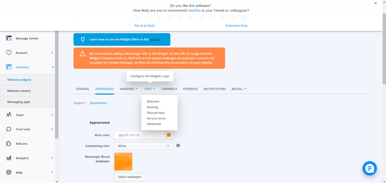 Userlike tilbyr også en tilbakemeldingsfunksjon og spørreundersøkelser etter chat som kan tilpasses med dine egne spørsmål og svar. I tillegg kan du aktivere proaktive chat-invitasjoner eller konfigurere chat-ruting for å sikre at kundesamtalene går til de riktige agentene. Denne funksjonen er forskjellig fra agentferdighetene nevnt ovenfor, og den ligner klassiske rutingalternativer du kanskje kjenner fra forskjellige chatløsninger eller IVR-programvare. Det er mange andre Userlike funksjoner å oppdage, og alle fungerer ganske bra.