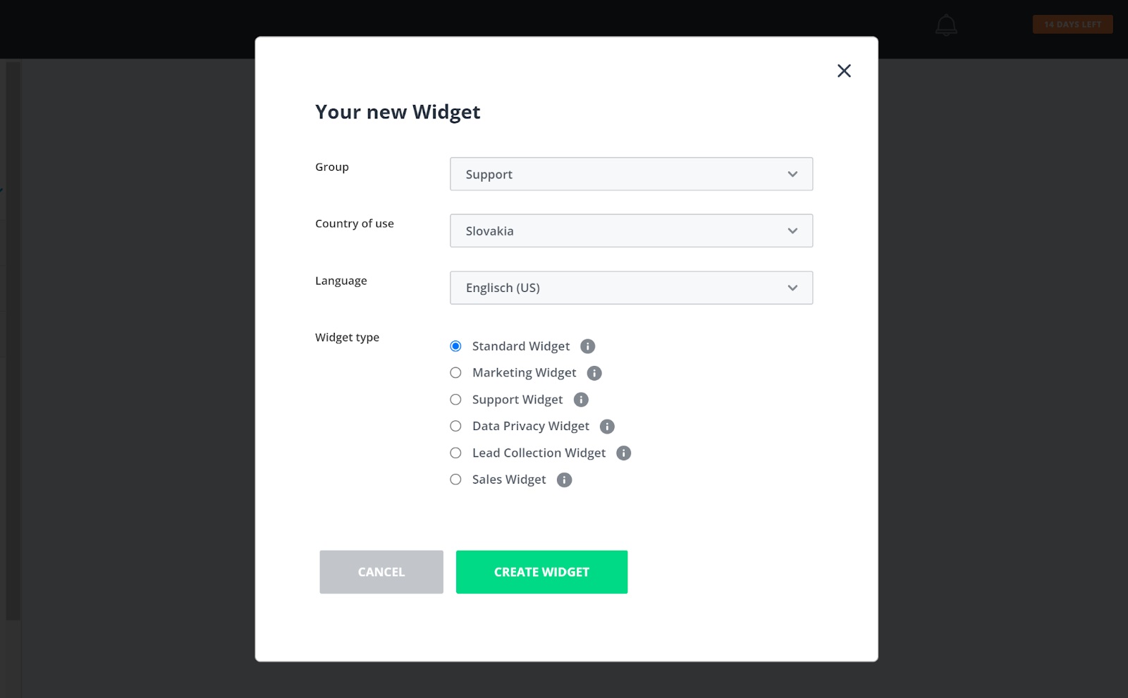 Jeg er glad for å si at resten av prosessen er mye mer intuitiv. Når du klikker på Legg til widget, kan du velge formål, språk og widgettype. Alternativet widget-type har noen forklaringer tilgjengelig for å hjelpe deg med å finne ut hva som er forskjellene mellom dem, men selve navnene er ganske selvforklarende. Når du er ferdig med denne delen, er de eneste alternativene som gjenstår å integrere widgeten eller konfigurere den først.