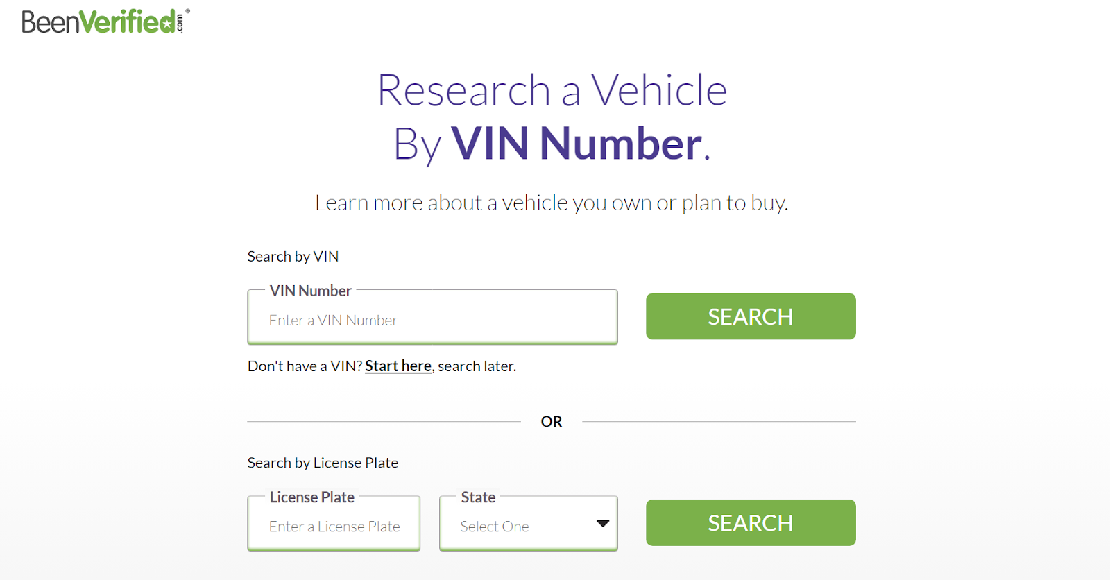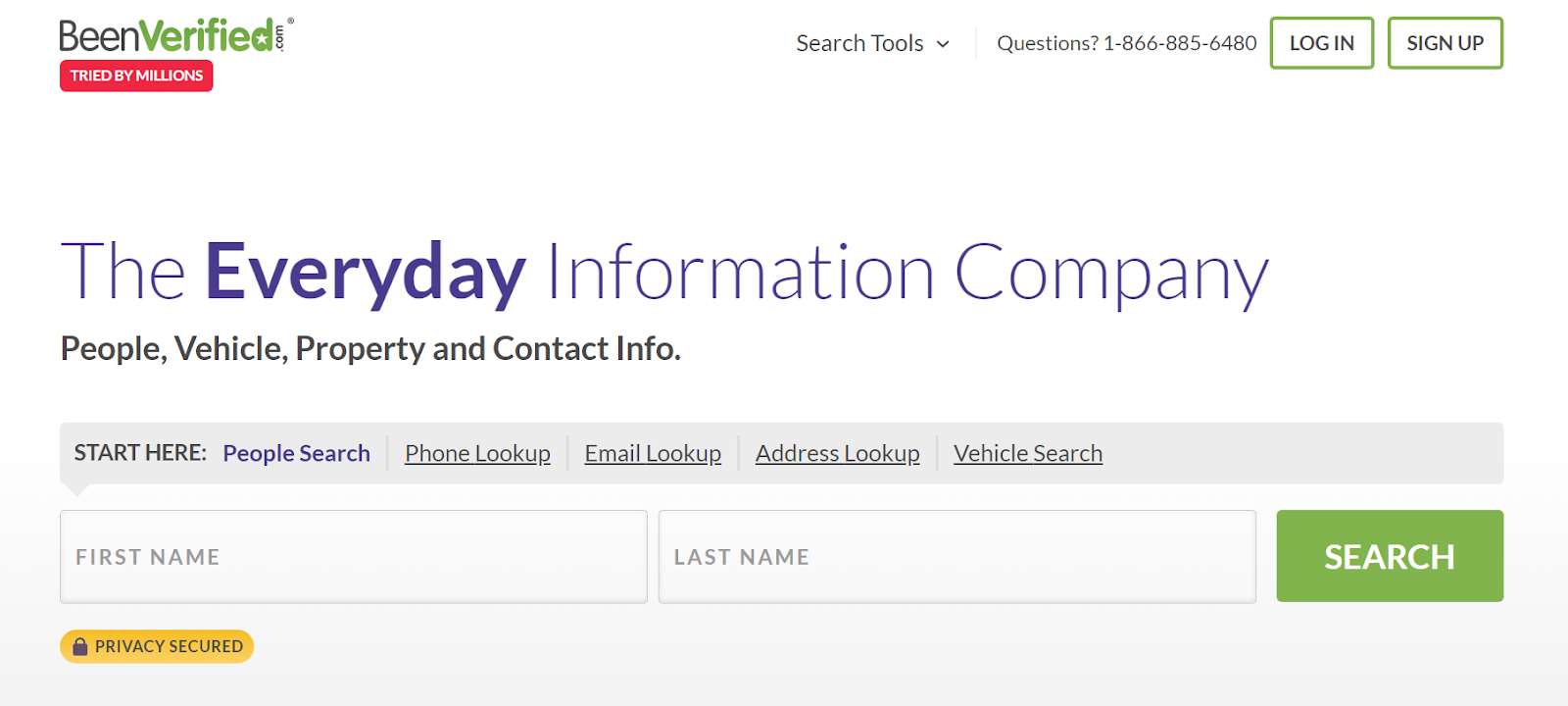 Når du går til BeenVerifieds hovedside, er det første du legger merke til søkealternativene. Du kan søke basert på navn, gjøre et omvendt telefonoppslagssøk, e-postoppslag, adresseoppslag og kjøretøysøk.