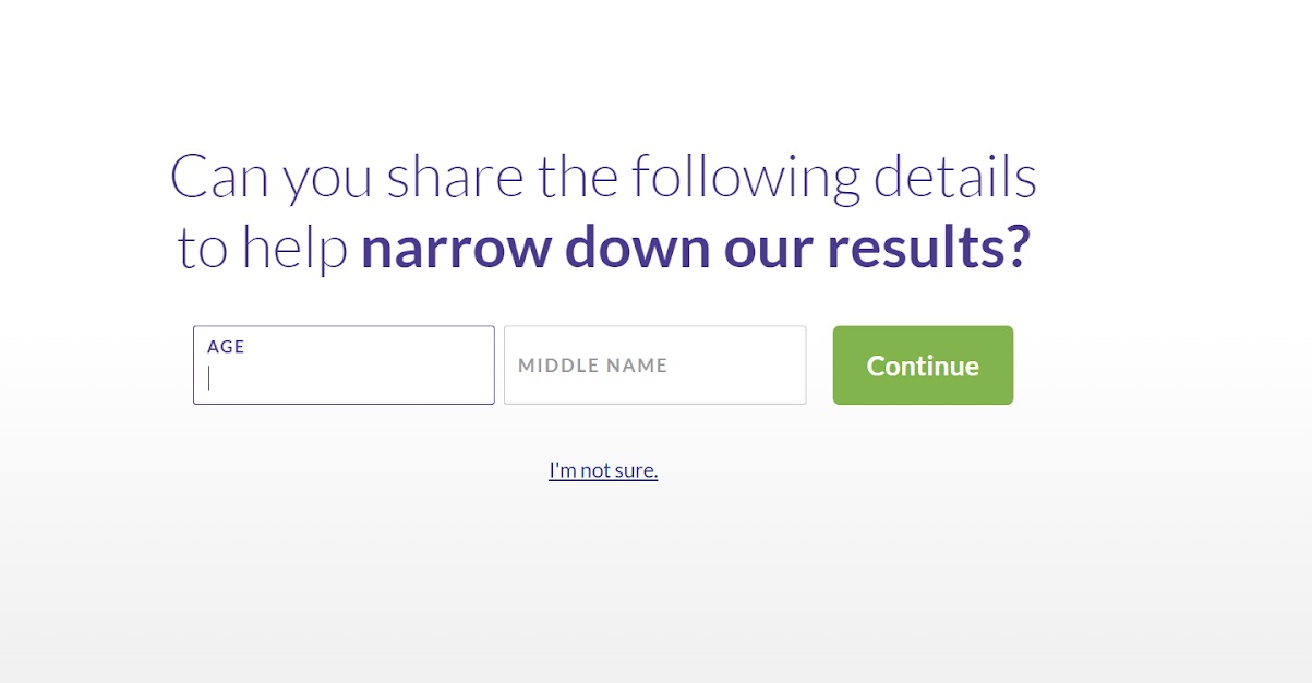 Du kan også begrense søket enda mer ved å skrive inn personens alder og mellomnavn. Hvis du ikke har denne informasjonen, kan du ganske enkelt klikke «Jeg er ikke sikker».