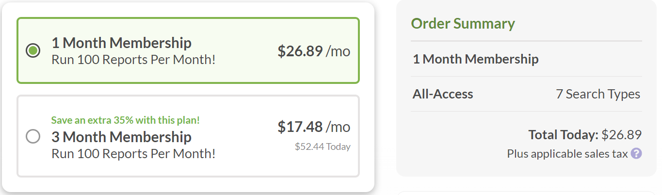- Det første alternativet er et månedlig medlemskap som koster $26,89 per måned og inkluderer alle de 7 søketypene nevnt tidligere. Med dette abonnementet kan du kjøre opptil 100 rapporter per måned.