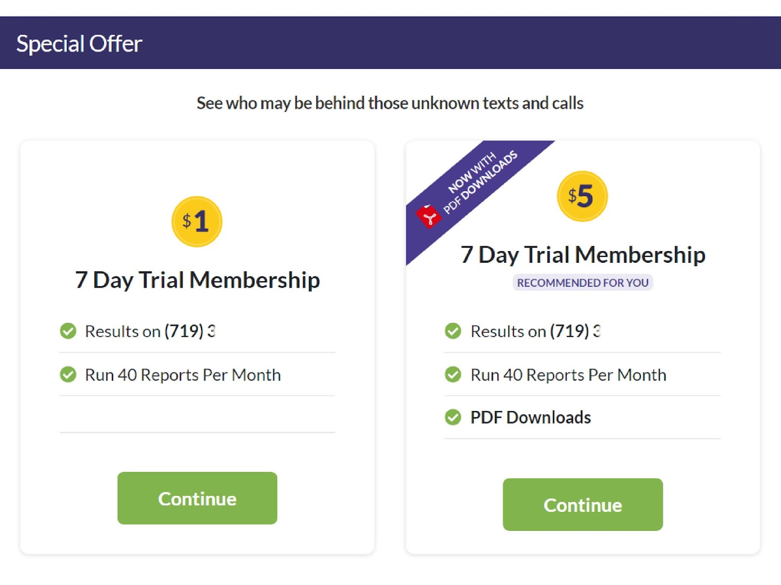 Du kan velge en 7-dagers prøveperiode for kun $1, som inkluderer opptil 40 rapporter per måned. Du kan også velge en 7-dagers prøveversjon for $5, som lar deg kjøre opptil 40 rapporter i måneden, pluss at du kan laste dem ned som PDF-filer.