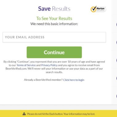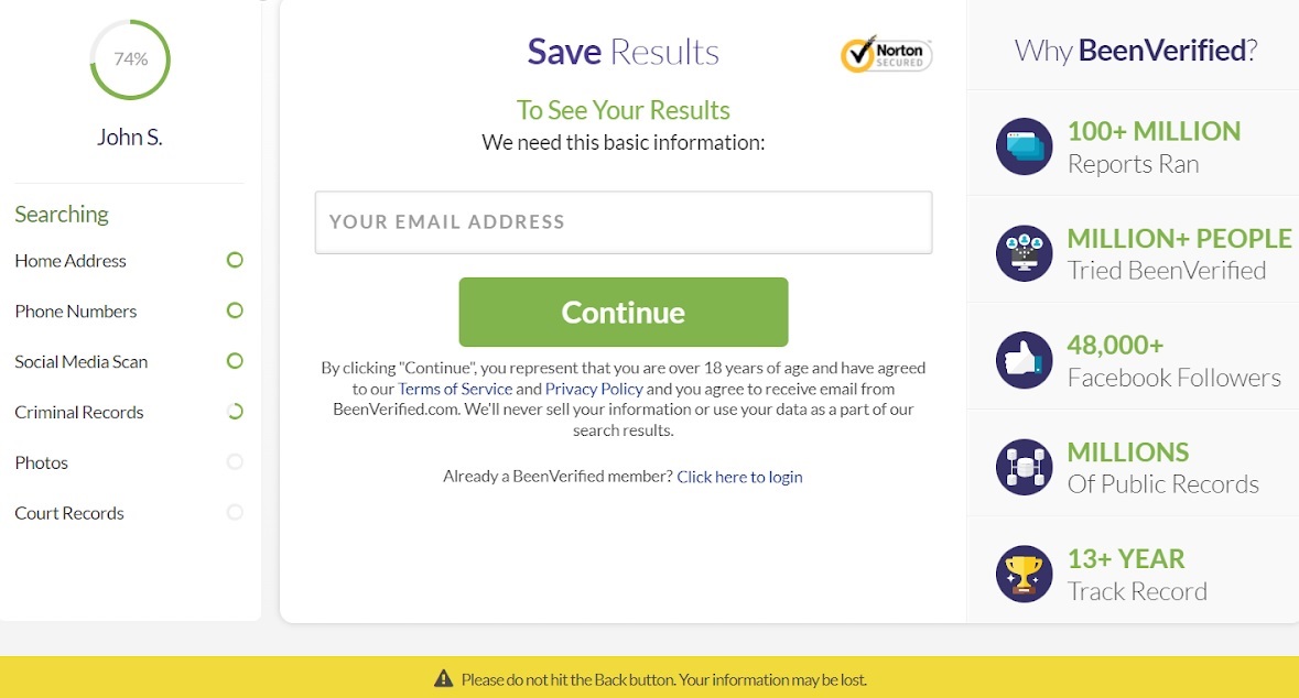 Deretter begynner BeenVerified å samle informasjonen fra databasen deres. Denne prosessen tar noen minutter, og etter at den er fullført, må du fylle inn e-postadresse og fullt navn for å lagre rapporten. Du kan ikke hoppe over dette trinnet hvis du ønsker å fortsette.