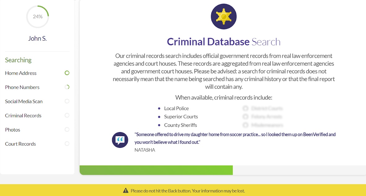 Når du skriver inn et telefonnummer i søkefeltet og trykker på enter, genererer nettstedet resultater og søker i databasen etter et samsvar. Den ser etter et navn knyttet til telefonnummeret, personens plassering, bakgrunnsinformasjon, kriminelle poster osv. Hele prosessen tar lengre tid sammenlignet med BeenVerifieds konkurrenter, men den er fortsatt ganske rask.