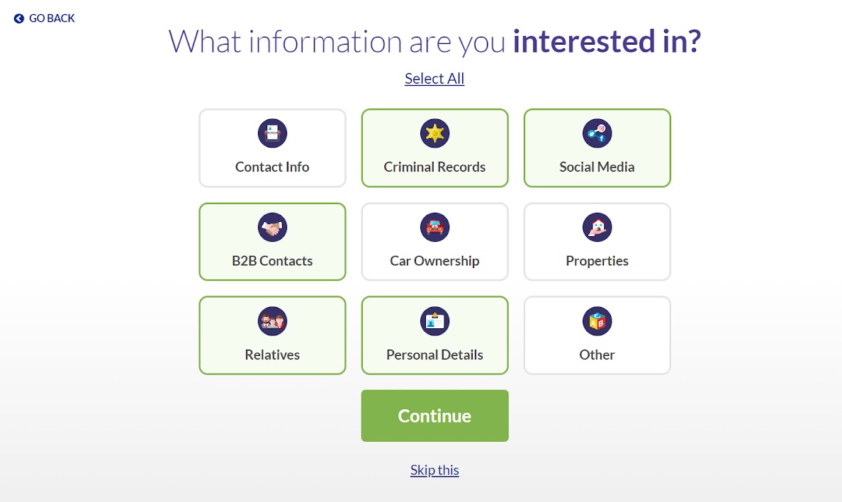 Deretter kan du velge hva slags informasjon du vil ha i rapporten din. Du kan velge så mange du vil og klikke Fortsett, eller hoppe over dette trinnet.