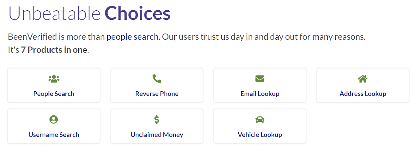 BeenVerified tilbyr 7 forskjellige produktfunksjoner: Personsøk, Omvendt telefonoppslag, e-postoppslag, adresseoppslag, brukernavnsøk, uavhentede pengeroppslag og kjøretøyoppslag.