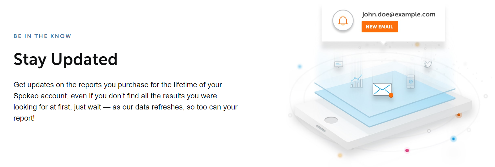 Spokeo gir oppdateringer om rapportene du tidligere har kjøpt, slik at du alltid vil ha tilgang til den nyeste informasjonen. Selv om databasen ikke kunne finne resultater på søketidspunktet, vil du kunne se den nye informasjonen og rapportene etter en oppdatering.