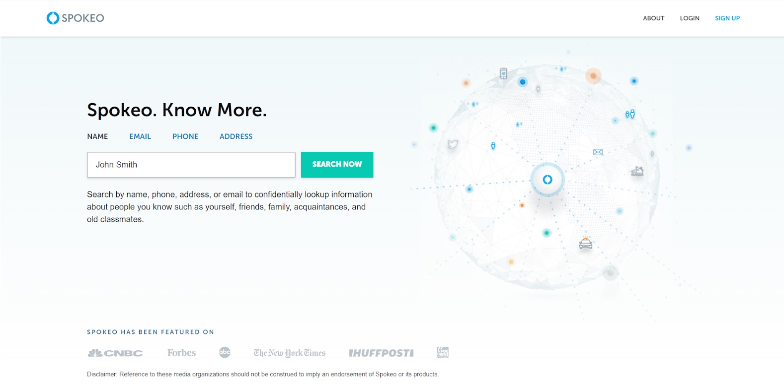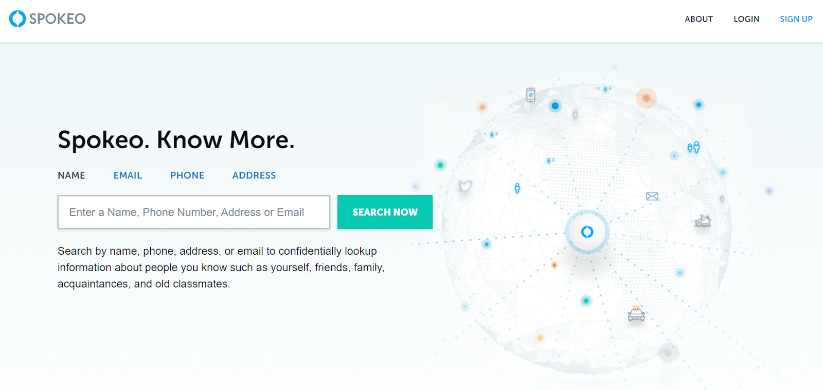 Det første du ser når du besøker siden er de fire søkealternativene. Du kan søke etter data basert på navn, adresse, telefonnummer eller e-postadresse. Spokeo er basert i USA, noe som betyr at den kun godtar telefonnumre registrert i USA, og all informasjon er begrenset til USA.
