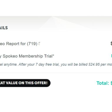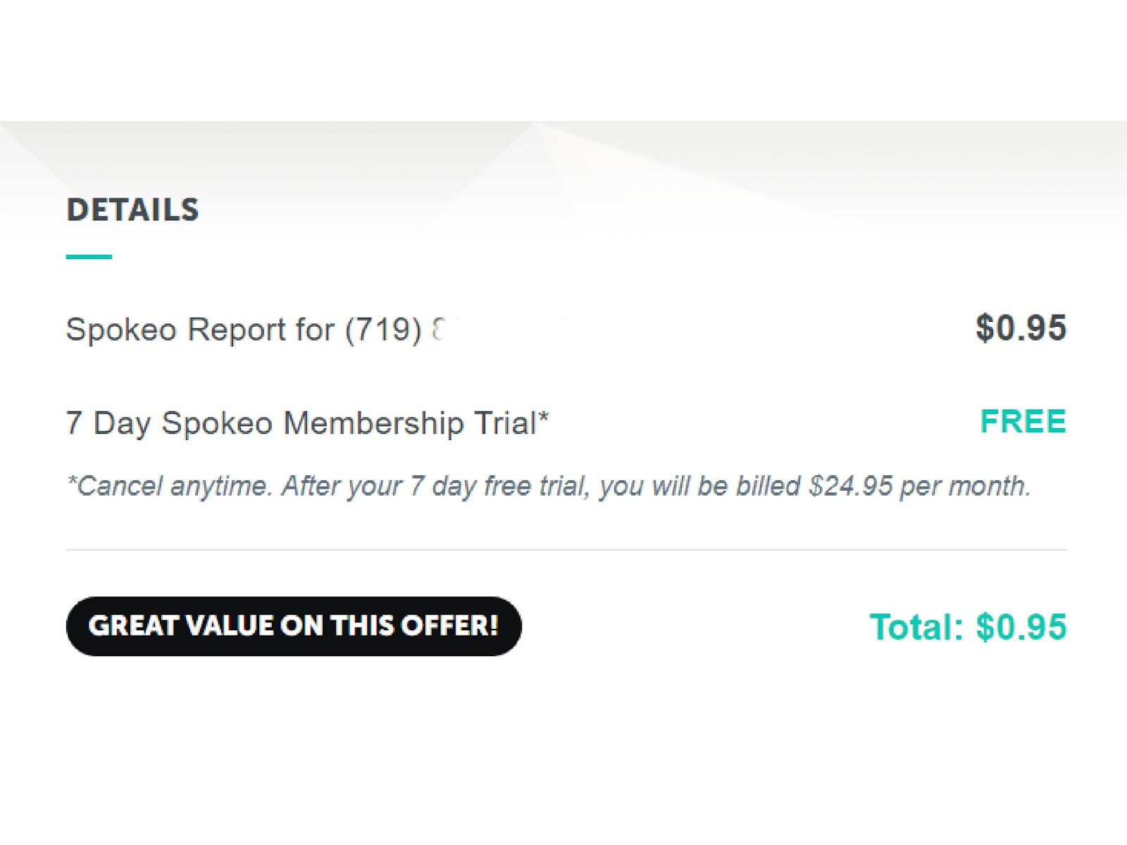 Spokeo tilbyr en 7-dagers gratis prøveperiode, pluss et kjøp av en enkelt rapport for $0,95. Du må imidlertid være forsiktig hvis du bestemmer deg for å registrere deg for den gratis prøveversjonen, for etter de første 7 dagene vil du bli fakturert $24,95 hvis du ikke avbryter. Dette skjer fordi du må oppgi kredittkortinformasjonen din selv om du bare registrerer deg for den gratis prøveversjonen.