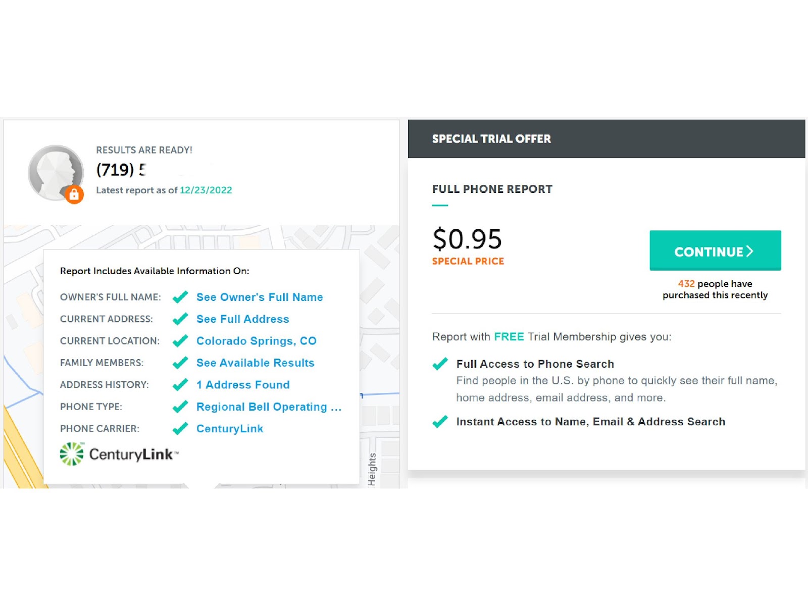 Datagenerering er rask med den omvendte funksjonen for oppslag av telefonnummer. Likevel var det skuffende at etter at Spokeo finner den ukjente innringeren, blir alle resultatene blokkert og krever at du blir medlem eller betaler tilleggsavgiften for en enkelt rapport.
