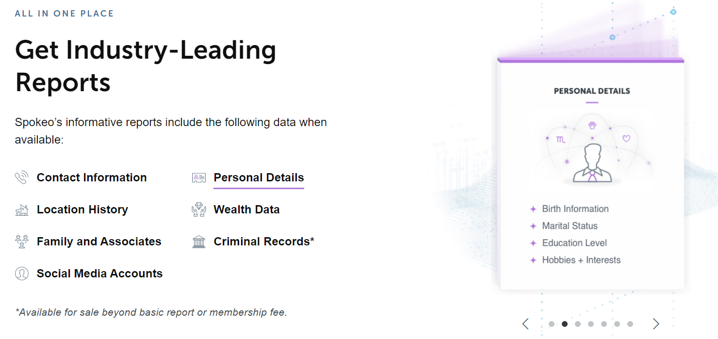 Foruten et enkelt søk, tilbyr Spokeo mange tilleggsfunksjoner. Du kan få tilgang til kontaktinformasjon, personlige detaljer, posisjonshistorikk, familiemedlemmer, kriminelle poster, sosiale medieplattformer og mer.