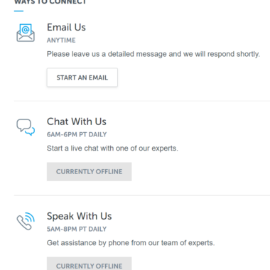Når du blar ned til bunnen av hovedsiden og klikker på “Besøk hjelpesenteret”, tar det deg til brukerstøttesiden deres. Det er noen ofte stilte spørsmål som kan hjelpe deg med å få svar på spørsmålene dine. Hvis du ikke finner det du leter etter, kan du klikke på “Kontakt vårt kundeserviceteam” og bruke en av de tre måtene å kontakte dem på.