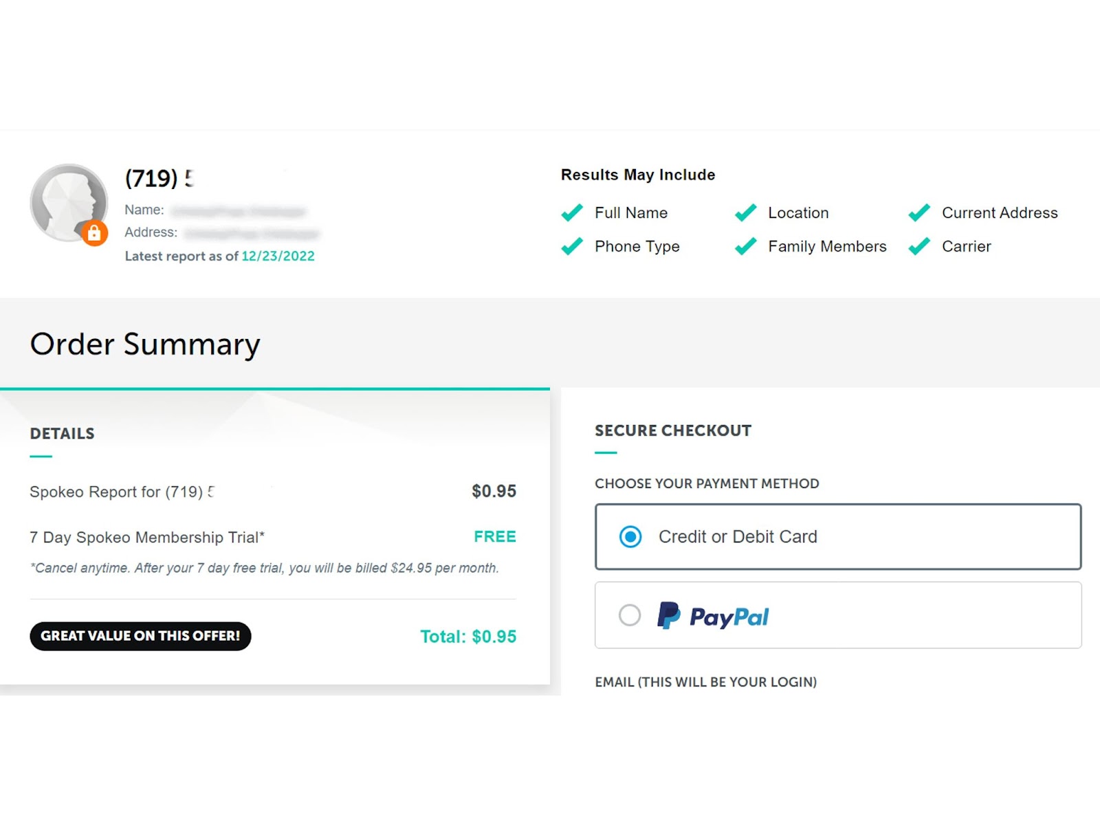 I motsetning til mange andre leverandører av omvendt telefonnummeroppslag, tilbyr ikke Spokeo en gratisversjon. Selv om det lar deg legge inn nummeret i søkefeltet, er alle resultatene låst fram til du betaler. Medlemskapsplaner og priser er ikke lett å finne på nettsiden, siden de ikke er samlet på ett sted. Derfor kan du slite med å finne dem.