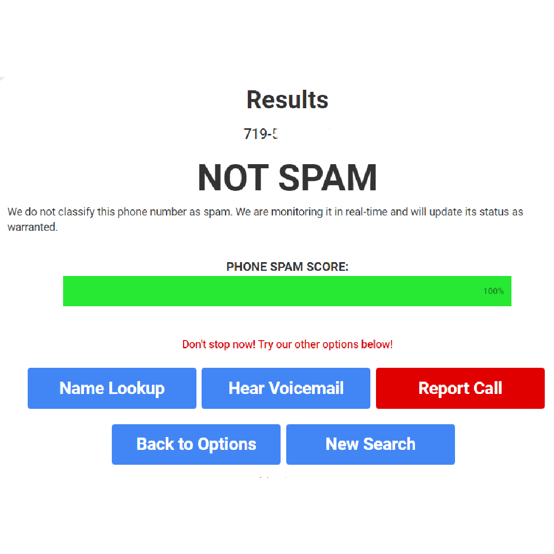 Når du velger “Telefonsøppelpost” og klikker “Søk”, vil den vise deg om Spy Dialer klassifiserer nummeret som søppelpost. Hvis nummeret rapporteres gjennom “Rapporter anrop”, vil Spy Dialer vise nummeret som spam.