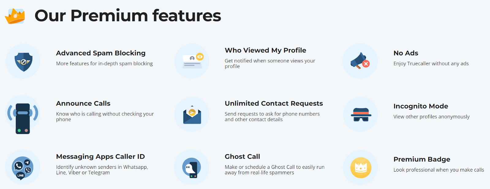 Truecaller tilbyr et bredt spekter av avanserte funksjoner som inkognitosamtaler, spøkelsesanrop, meldingsapper-anrops-ID, kunngjøring av anrop og mange flere. De er imidlertid ikke alle tilgjengelige i gratisversjonen.