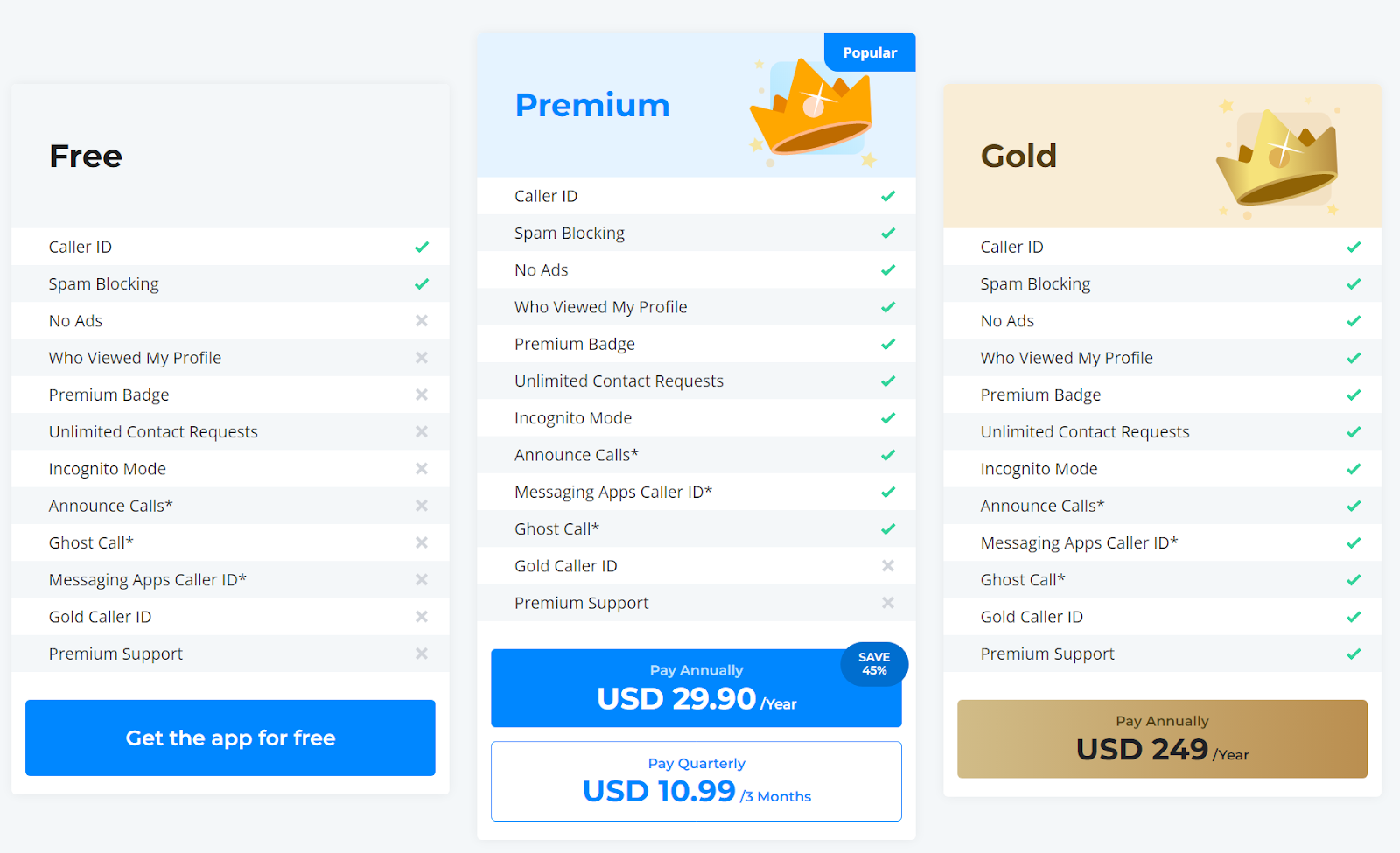 Denne versjonen kan bare betales årlig, til en pris av $249. Den inkluderer alle funksjonene fra gratis- og premiumversjonene, pluss tilleggsfunksjoner som Gold Caller ID og Premium-støtte. Premium-støtten gir raskere svar på alle spørsmål du måtte ha.